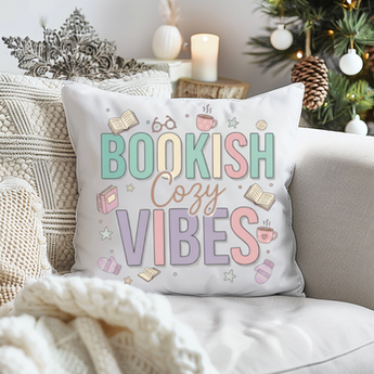 This pastel-themed design features bold text reading “Bookish Cozy Vibes,” surrounded by illustrated books, steaming mugs, mittens, stars, and glasses. The soft color palette and playful layout evoke warm, comfy reading sessions and introvert joy. Perfect for bookworms who love cozy aesthetics and calm indoor days with their favorite reads.