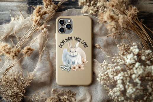This heartwarming design features a soft watercolor bunny surrounded by muted winter florals and evergreen foliage, paired with the phrase “Soft Heart, Brave Spirit.” The gentle tones and serene expression evoke a sense of inner strength and tenderness. Perfect for lovers of calm woodland animals, emotional expression through art, and soft nature-inspired aesthetics.